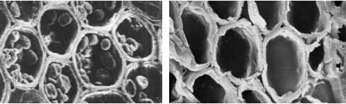 左圖是未經處理的竹子分子結構,右圖是經過處理之后的竹子分子結構。