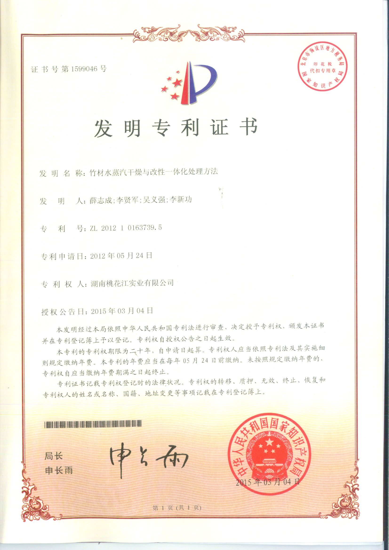 2006年,桃花江經過多年研究,逐漸掌握了通過增加竹子的密度,同時經過炭化和防腐的新型竹材加工技術,成功解決了竹制材料不能廣泛運用于戶外的世界性難題,獲得了竹制材料研究方面的巨大的突破。該項技術完美的解決了竹材戶外運用上的防腐性、耐磨性和穩定性問題。這種技術被稱為“高炭防腐技術”,2006年這項技術已經申請發明專利,是我國戶外竹材研究領域的首個個發明專利,故桃花江竹材科技被譽為是我國竹材領域“高炭防腐的發明者”。此后桃花江竹材科技進行了大量的相關的實驗室檢測和實際測試,結果證明,高炭防腐技術是目前唯一可以讓竹子戶外應用的解決辦法。未經處理過的竹子,耐久性等級為5級(EN350標準),耐久性不夠。經過熱高炭防腐技術處理后的竹子,尺寸可進行定制,材料穩定性提高了50%左右。耐久性也從原來的5級提高到最高等級1級(EN350-1標準1級,ENV807標準1級,EN113標準1級)經過熱處理的竹子同時可以有效地抵抗淺表真菌。(EN152標準0級)桃花江高炭防腐戶外地板,使用風險等級達到4級(標準EN335)是市場上唯一達到此標準的竹產品。